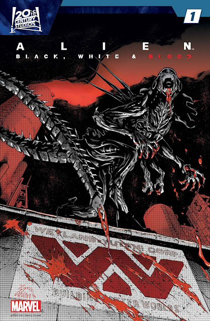 - Cambiando de tema, los xenomorfos se apuntan al formato blanco, negro y rojo que tan bien le ha funcionado últimamente a personajes como Lobezno o el Caballero Luna. Alien: Black, White & Blood será una miniserie antológica de cuatro números en la que veremos distintas historias narradas con estos tres colores, pero con un nuevo añadido: el color verde. Imagino que será por la sangre ácida de los xenomorfos. Vamos a echarle un vistazo a sus contenidos: